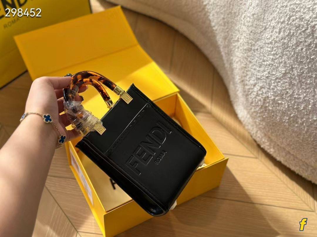 The Fendi Mini Sunshine Shopper Bag in Black is a timeless and versatile piece from the Sunshine collection. Crafted from smooth premium leather, it features the embossed “FENDI ROMA” logo and the iconic tortoiseshell-effect plexiglass handles. Compact yet highly functional, this mini tote (Size: 18×12 cm) is perfect for elevating both casual and formal looks. With its detachable shoulder strap, it can be carried by hand, worn on the shoulder, or styled crossbody.