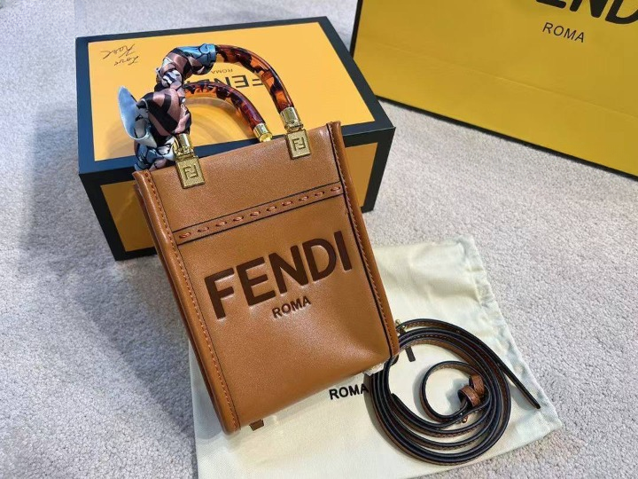 The Fendi Mini Sunshine Shopper Bag in Brown brings a warm and elegant touch to the Sunshine collection. Made from smooth premium leather, it showcases the embossed “FENDI ROMA” logo and the signature tortoiseshell-effect plexiglass handles. Compact and stylish, this mini tote (Size: 18×12 cm) is perfect for everyday wear, adding a refined tone to both modern and classic outfits. With its detachable shoulder strap, it can be carried by hand, worn on the shoulder, or crossbody.