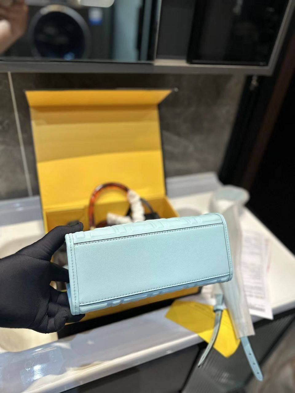 The Fendi Sunshine Shopper Handbag in white (Size: 25×21 cm) is a chic and versatile luxury tote crafted from smooth leather. Showcasing the bold embossed “FENDI ROMA” logo and refined tortoiseshell-effect plexiglass handles, it exudes elegance and practicality. With a detachable shoulder strap, this handbag easily transforms from a hand carry to a shoulder or crossbody bag, making it the perfect companion for day-to-day wear.