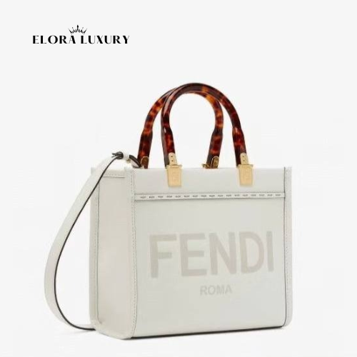The Fendi Sunshine Small Leather Bag in white (Size: 25×22 cm) is a chic and versatile tote crafted from smooth premium leather. Featuring the iconic embossed “FENDI ROMA” logo and tortoiseshell-effect plexiglass handles, this bag perfectly blends timeless elegance with everyday functionality. The detachable shoulder strap offers flexible styling — carry it by hand, over the shoulder, or crossbody.