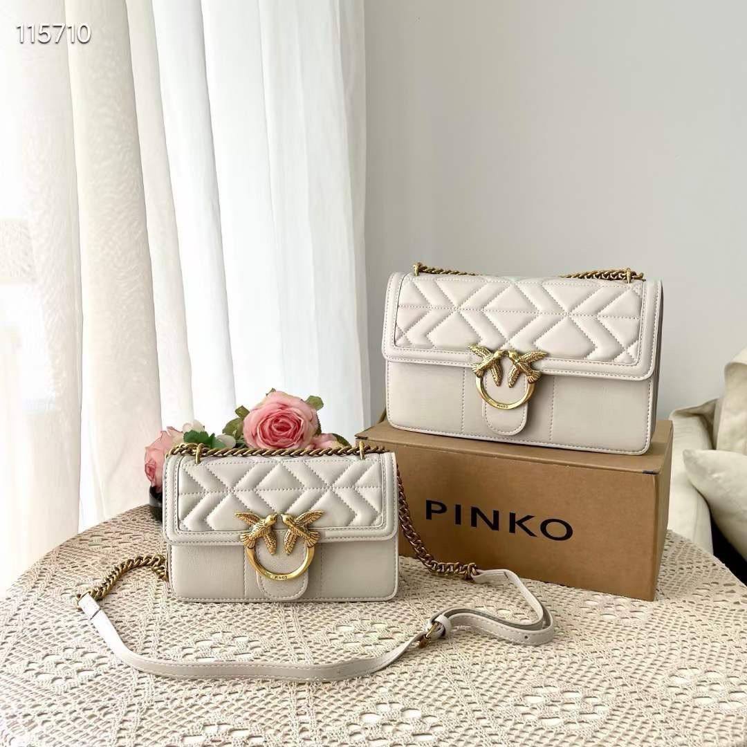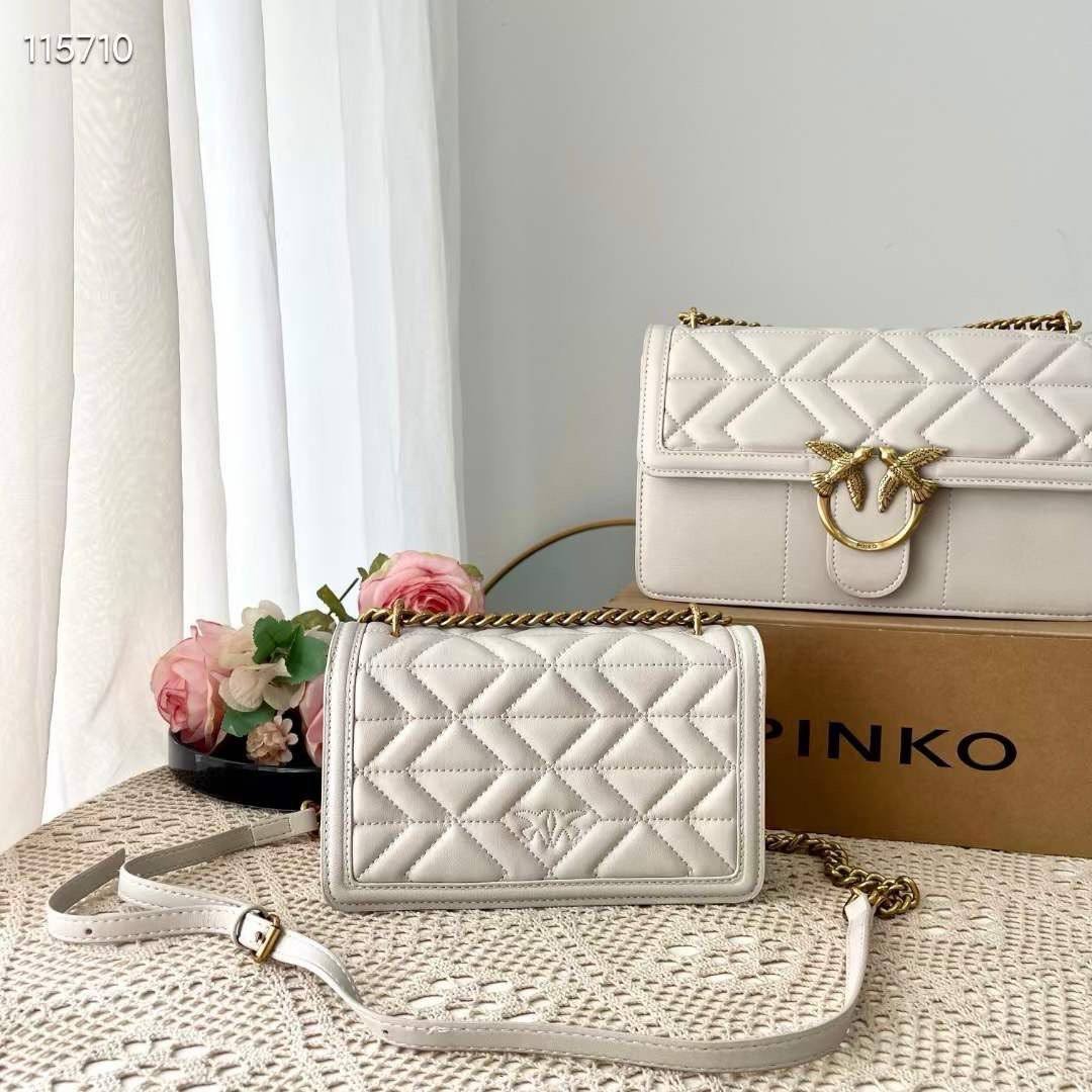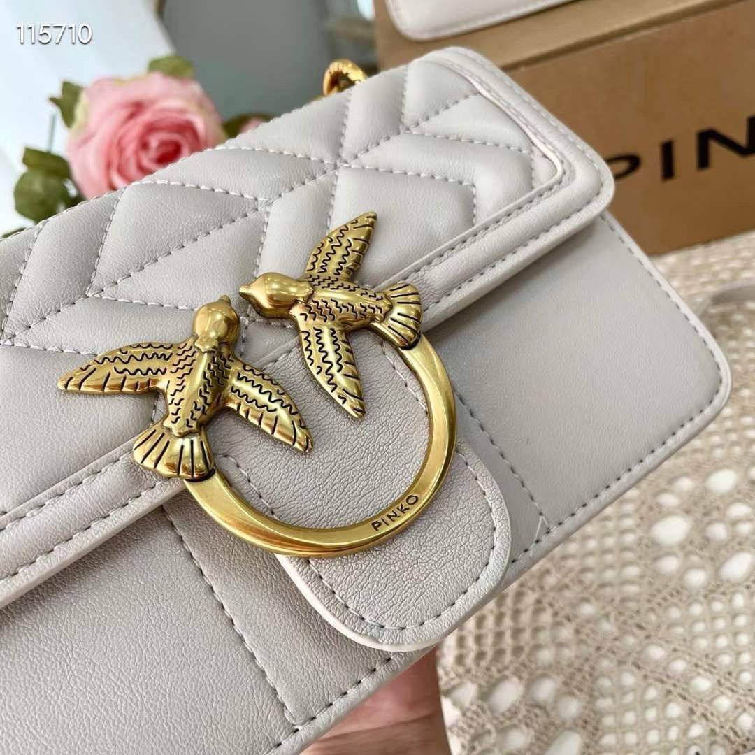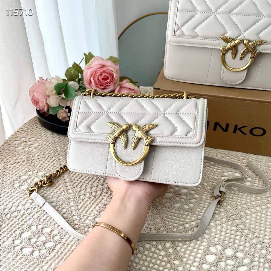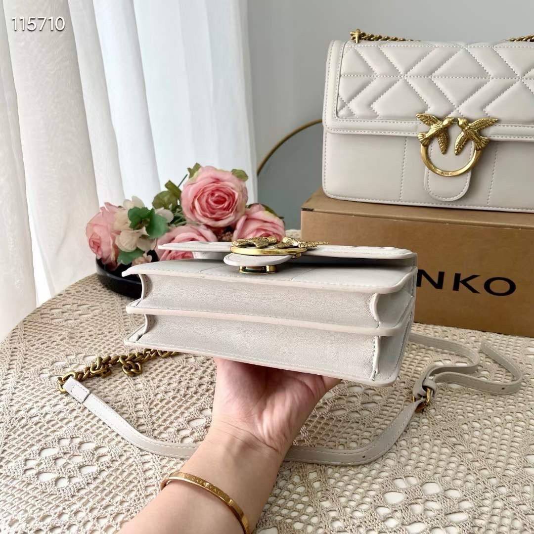 The Pinko Classic Love One Bag – White is crafted from premium white leather and features the iconic Love Birds gold buckle. Available in Mini for compact elegance and Medium for versatile daily use, it adds sophistication to any outfit.