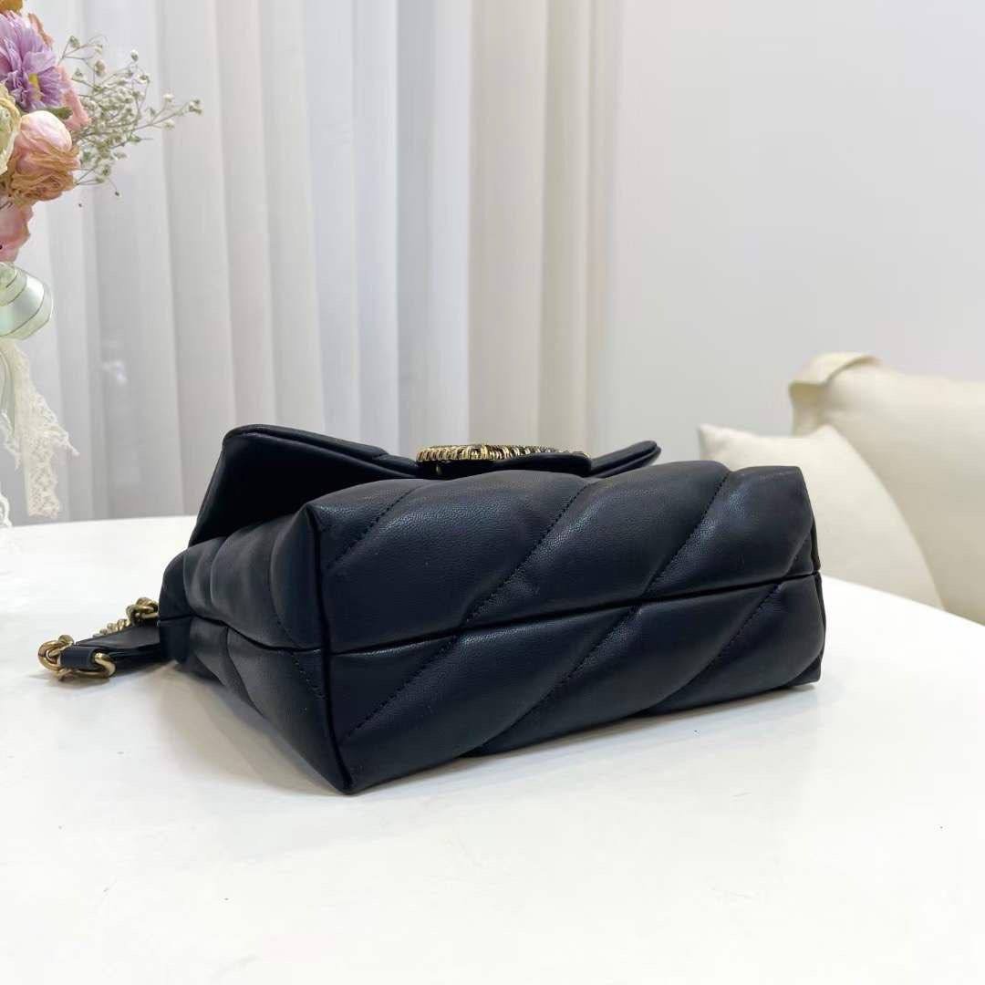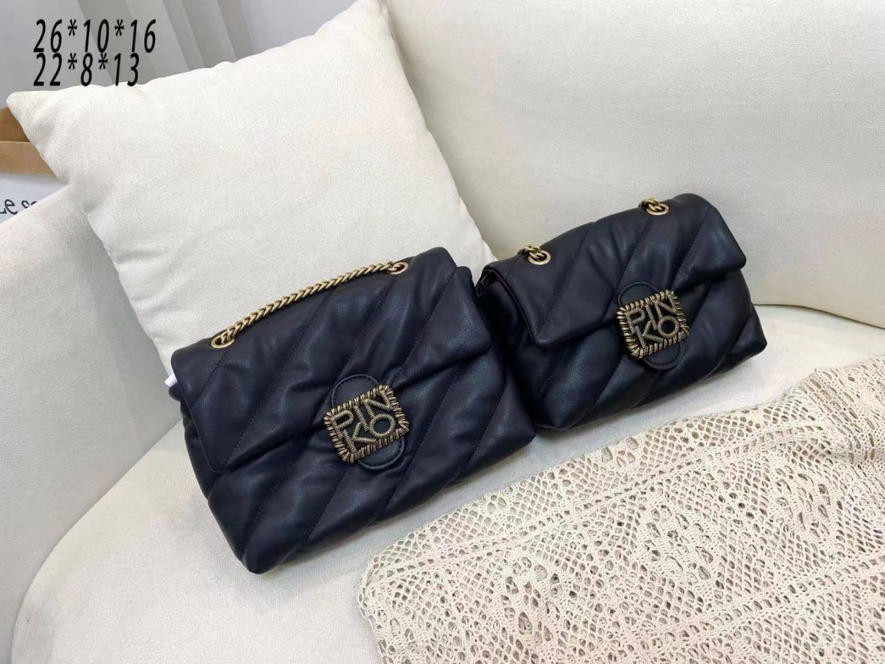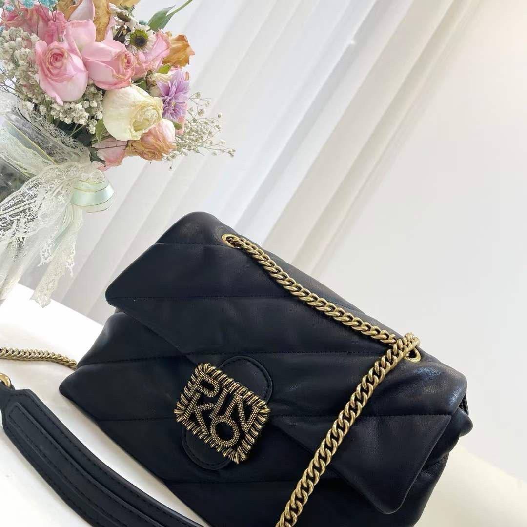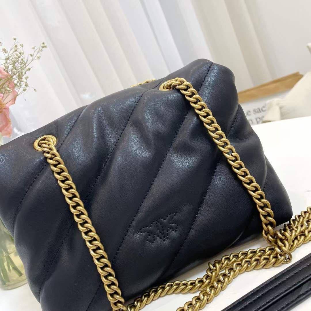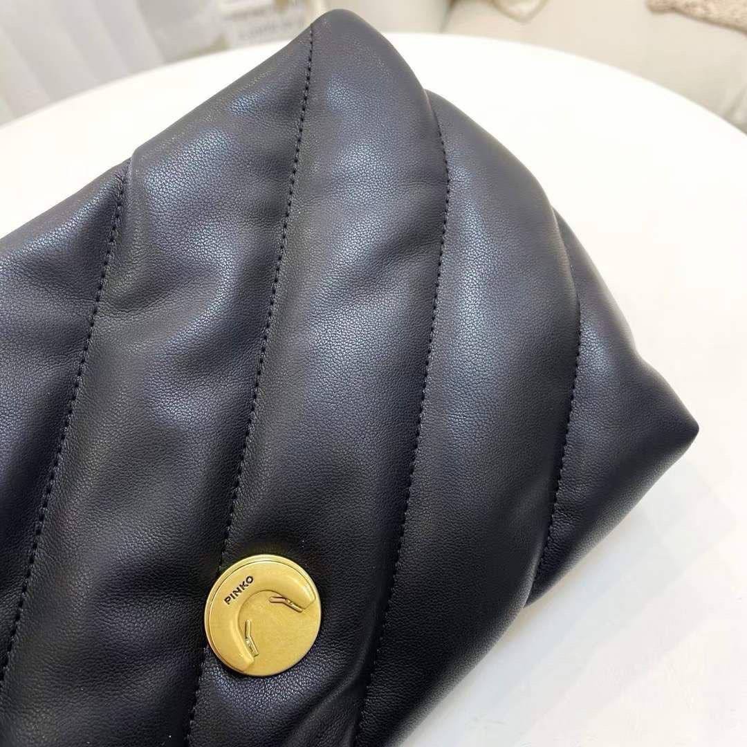 The Pinko Love Classic Puff Maxy Quilt Jewel Bag – Black is crafted from premium quilted black leather and adorned with sparkling crystal details under the signature Love Birds gold buckle. Available in Mini for compact elegance and Medium for versatile daily use, it adds sophistication and glamour to any outfit.