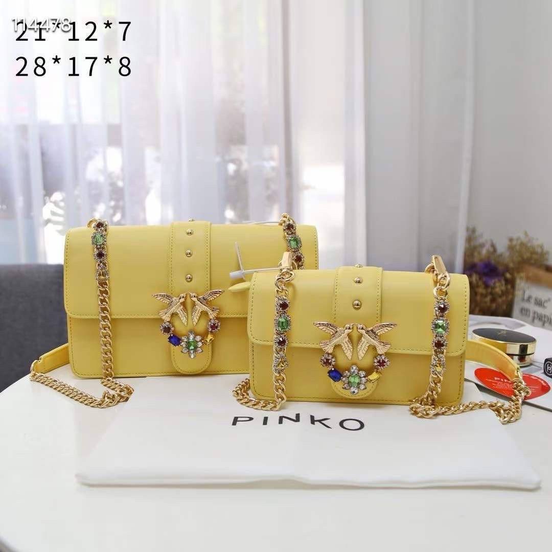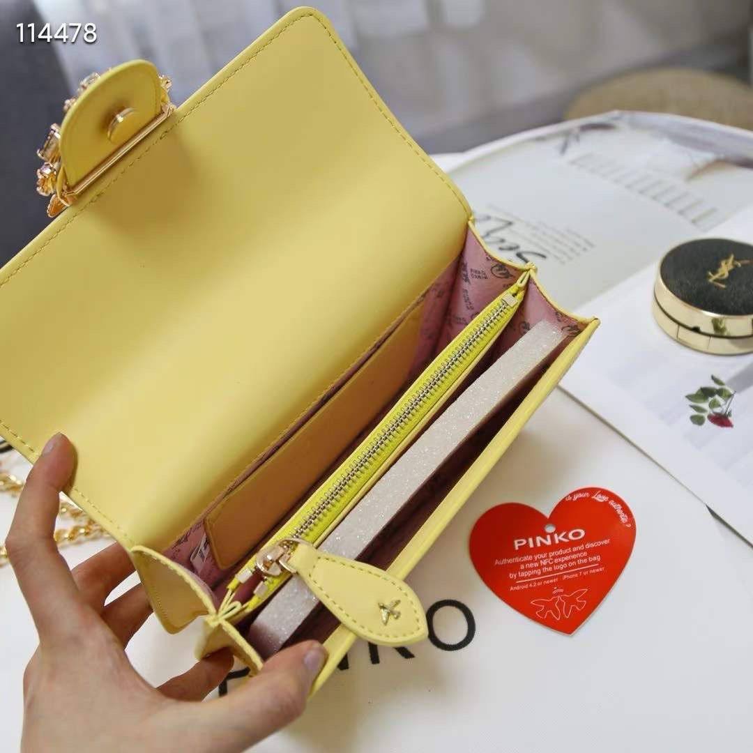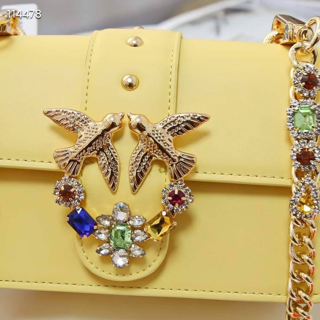 The Pinko Love Jewels Bag – Yellow is crafted from premium yellow leather and adorned with sparkling crystal details under the signature Love Birds gold buckle. Available in Mini for compact elegance and Medium for versatile daily use, it’s perfect for evening events or adding a touch of glamour to any outfit.