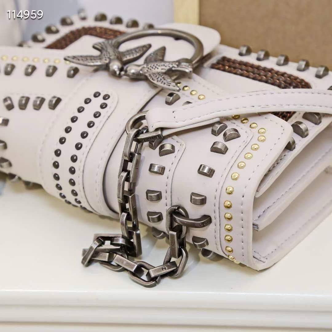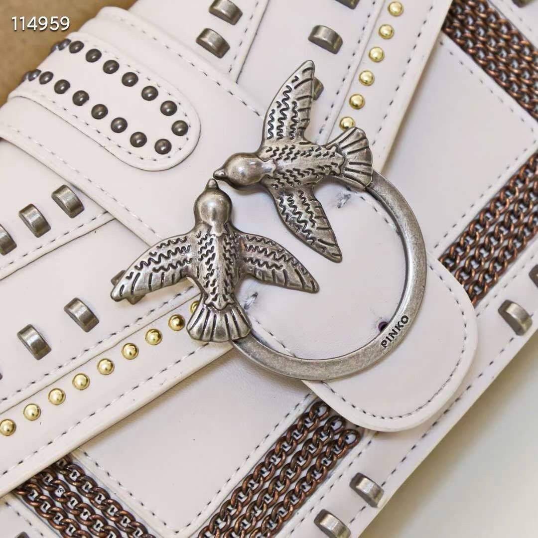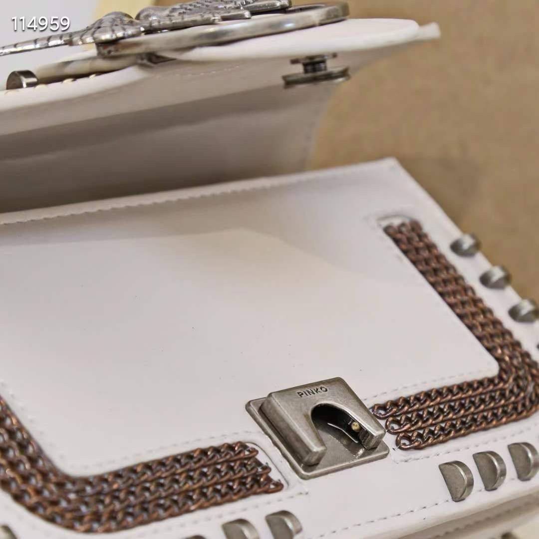 The Pinko Love Mix Studs Bag – White is a sophisticated statement bag crafted from premium white leather. Decorated with striking stud embellishments and highlighted by the signature Love Birds buckle, it combines modern edge with timeless elegance. Featuring a versatile chain strap, it can be worn crossbody or on the shoulder, perfect for both daytime chic and evening glamour.