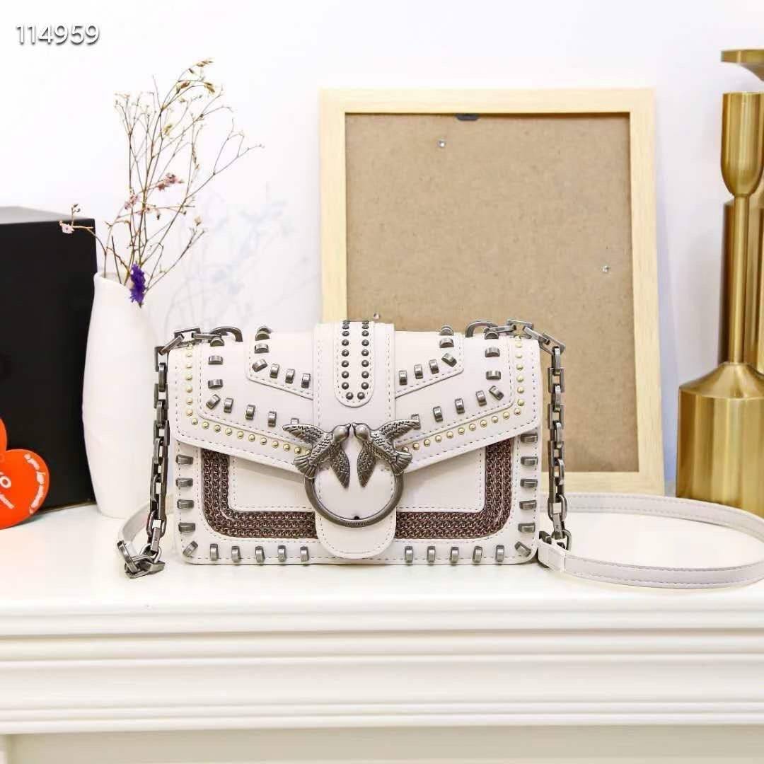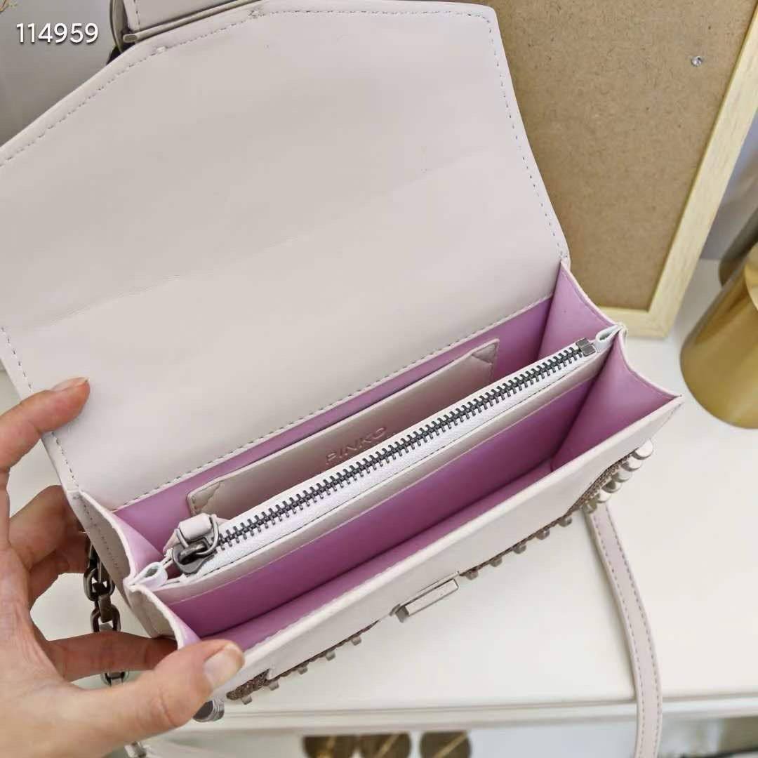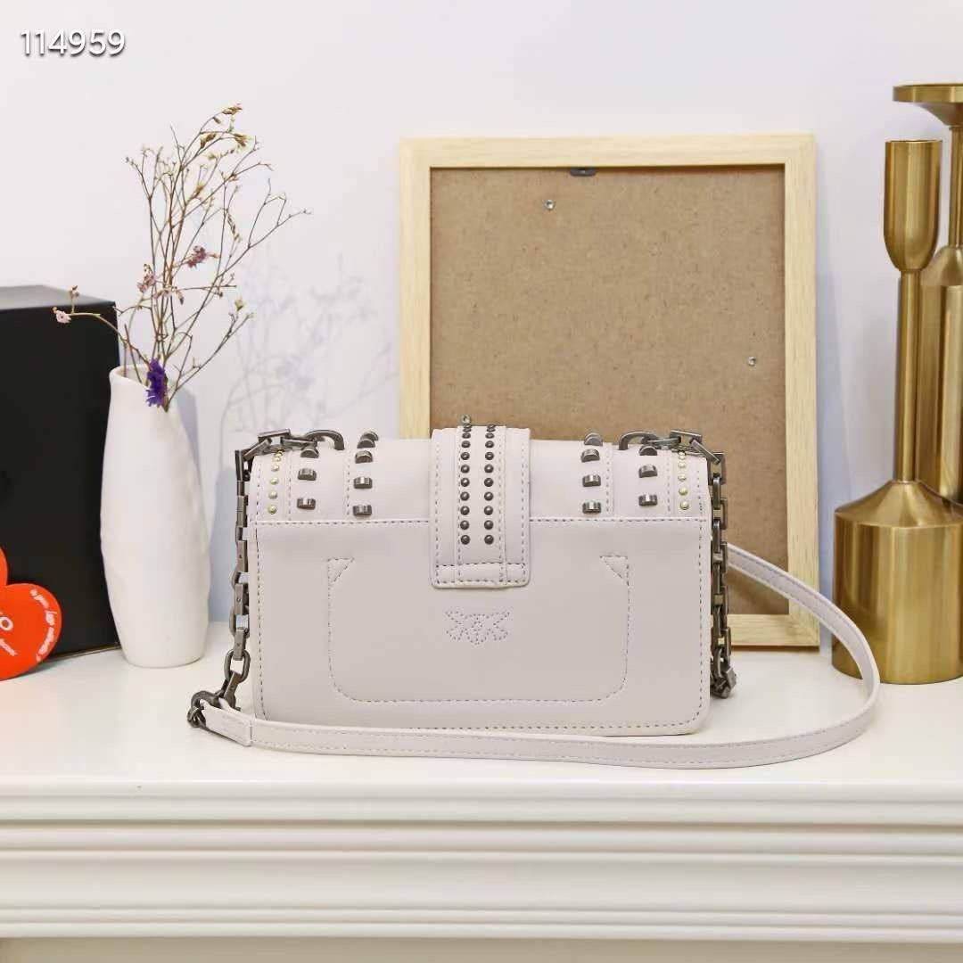 The Pinko Love Mix Studs Bag – White is a sophisticated statement bag crafted from premium white leather. Decorated with striking stud embellishments and highlighted by the signature Love Birds buckle, it combines modern edge with timeless elegance. Featuring a versatile chain strap, it can be worn crossbody or on the shoulder, perfect for both daytime chic and evening glamour.