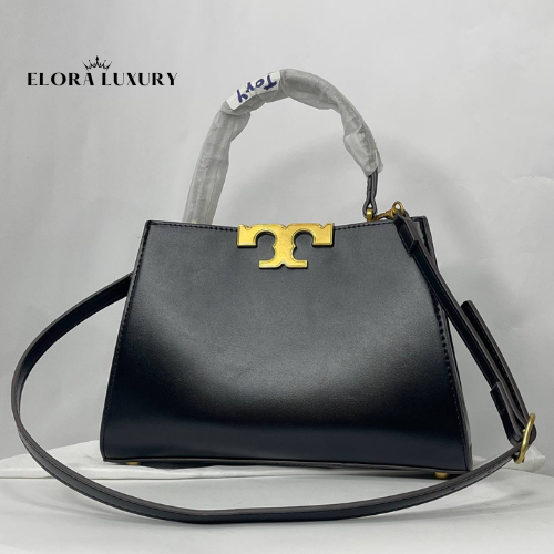 The Tory Burch Eleanor Satchel Bag in Black (26×18 cm) is crafted from smooth leather and features the signature gold-tone Tory Burch logo hardware. With its compact yet functional size, this bag is perfect for daily wear or evening outings, offering both elegance and practicality.